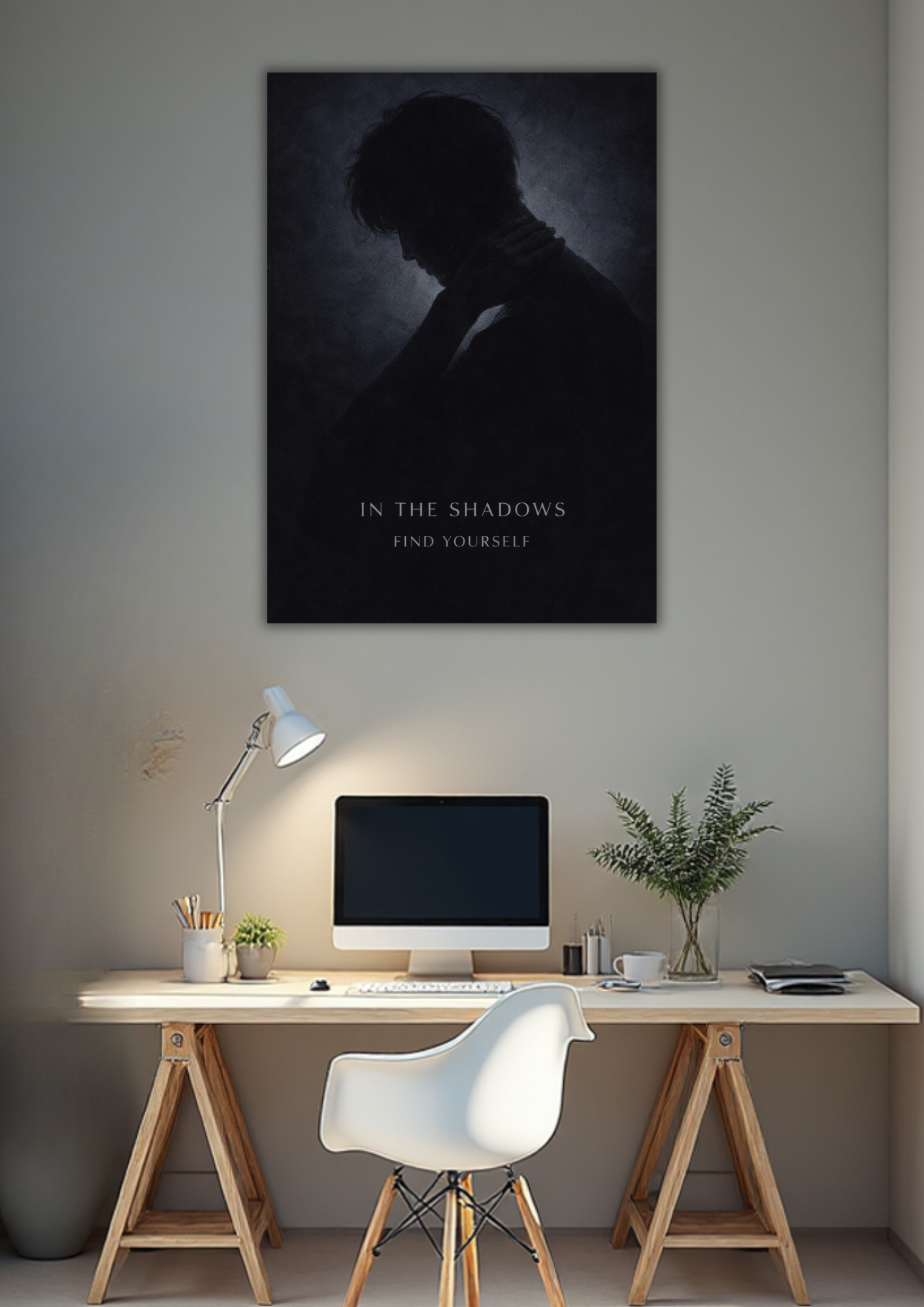 This minimalist dark wall poster presents a subtle silhouette emerging from shadow, capturing themes of introspection, identity, and quiet strength.