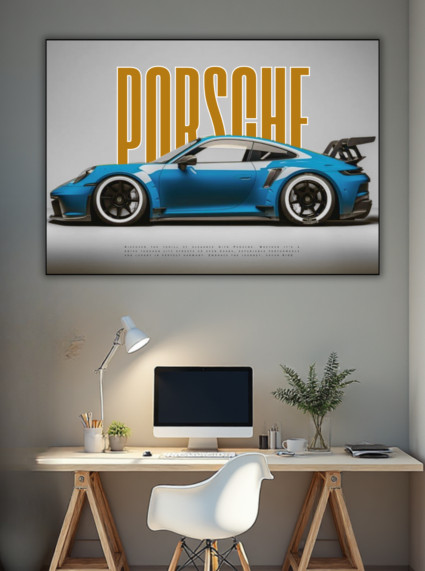 Bring speed, power, and luxury to your walls with this Porsche Supercar Poster. Featuring a stunning blue Porsche in a premium studio aesthetic, this artwork is perfect for car lovers, bedroom decor, gaming setups, office walls, and supercar enthusiasts.