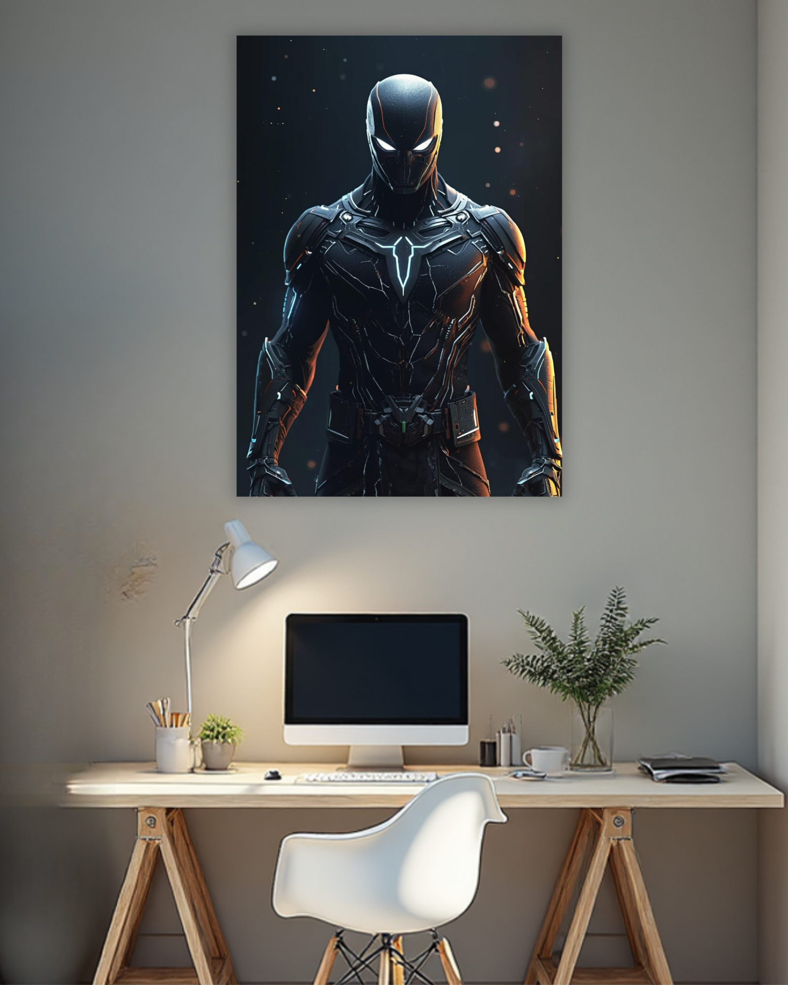 An ultra-realistic futuristic superhero poster featuring advanced black armor and glowing tech details. Perfect for modern interiors, gaming rooms, and studios.