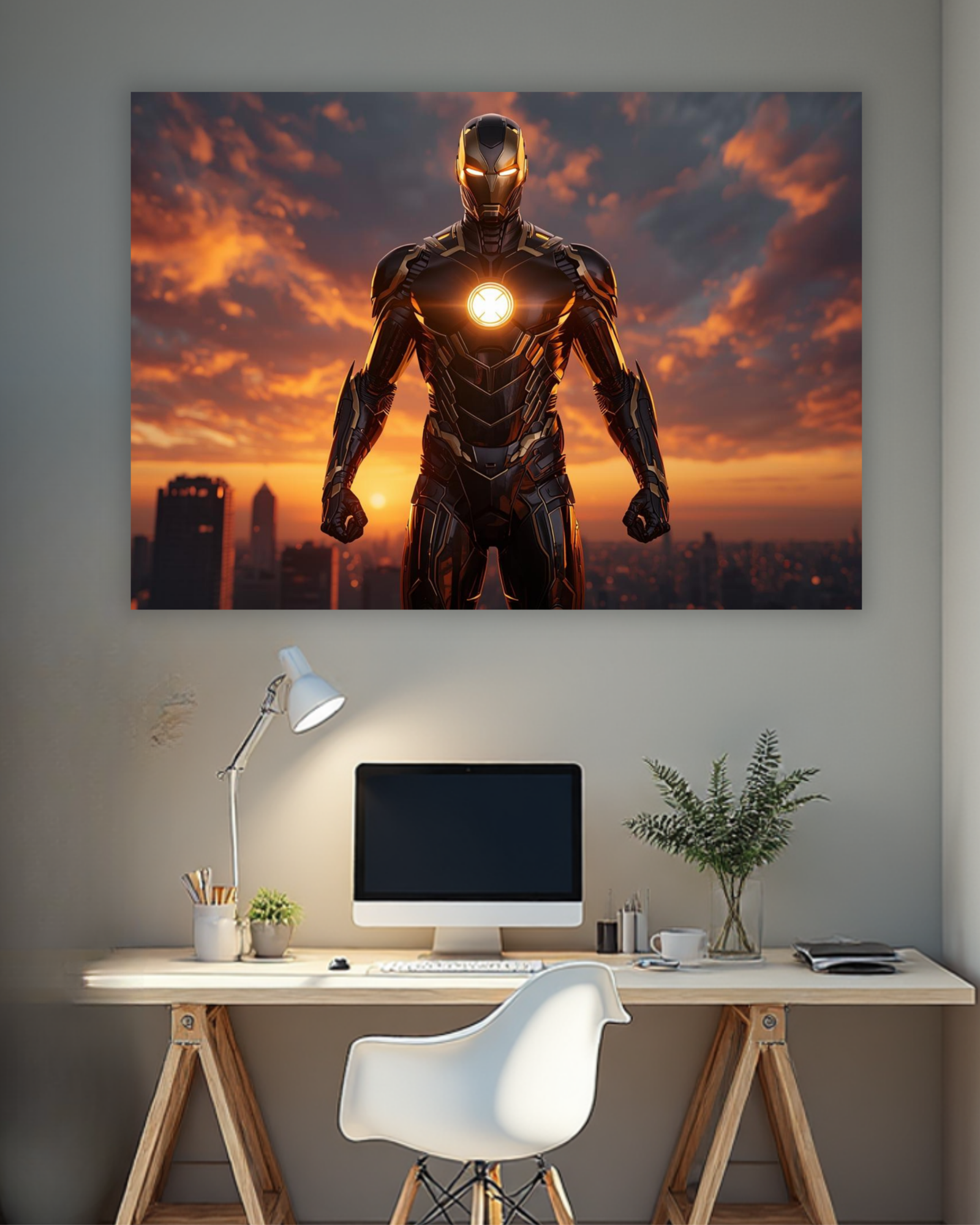 A high-impact futuristic superhero featuring glowing energy core design with sunset backdrop. Premium wall art for bold interiors.